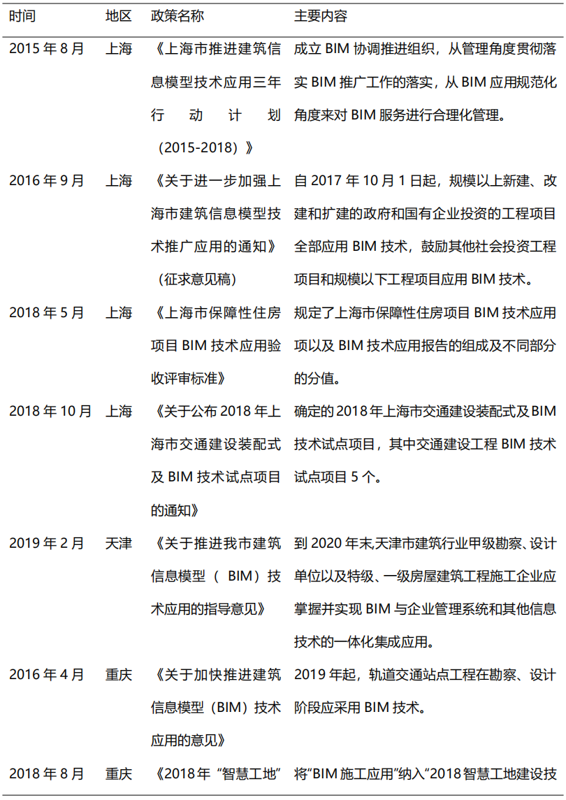 從2014年開始,在住建部的大力推動下,各省市政策相繼出臺BIM推廣應用文件,到目前我國已初步形成BIM技術應用標準和政策體系,為BIM的快速發(fā)展奠定了堅實的基礎。2017年,貴州、江西、河南等省市正式出臺BIM推廣意見,明確提出在省級范圍內(nèi)提出推廣BIM技術應用。2018-2019年,各地政府對于BIM技術的重視程度不減,重慶、北京、吉林、深圳等多地政策出臺指導意見,旨在推動BIM技術進一步應用普及。隨著我國出臺BIM推廣意見的省市數(shù)量逐漸增多,全國BIM技術應用推廣的范圍更加廣泛。表2列舉了部分重要地方鼓勵政策。