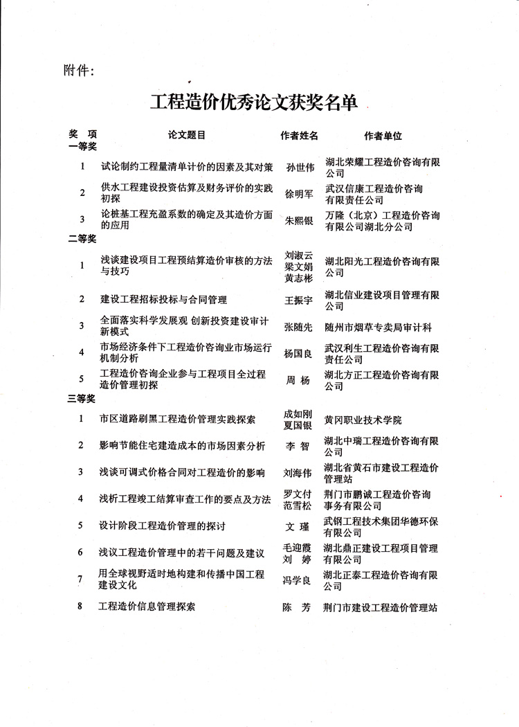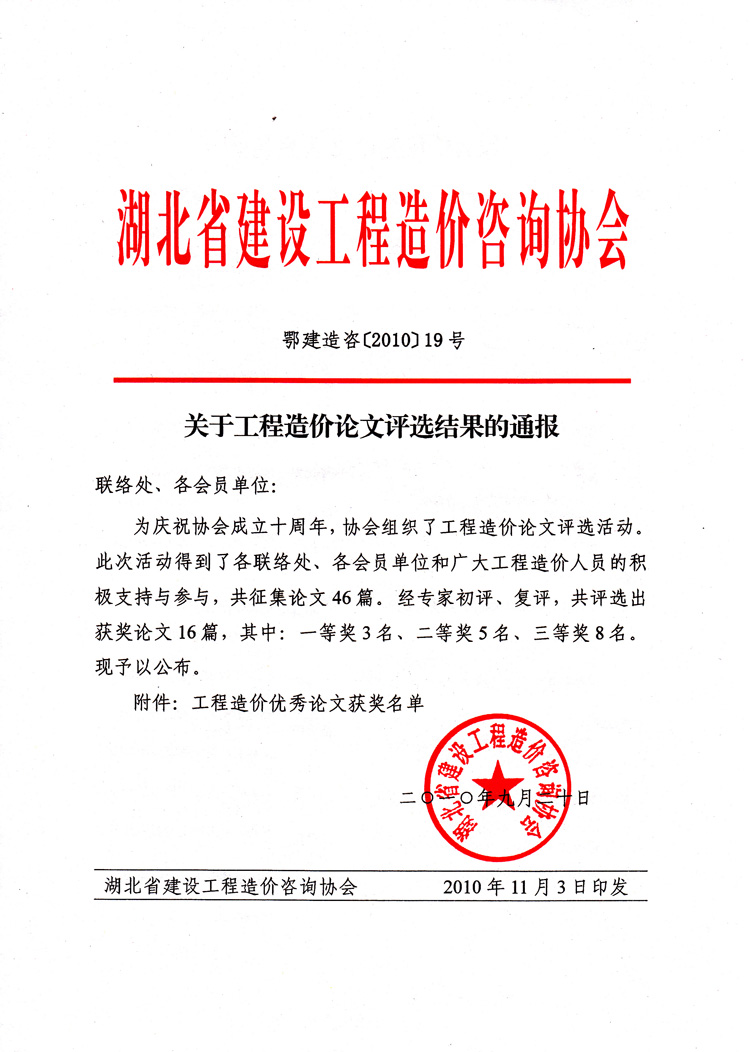 熱烈祝賀我公司在湖北省建設(shè)工程造價咨詢協(xié)會十周年之際舉辦的“工程造價論文評選活動”中獲得三等獎。