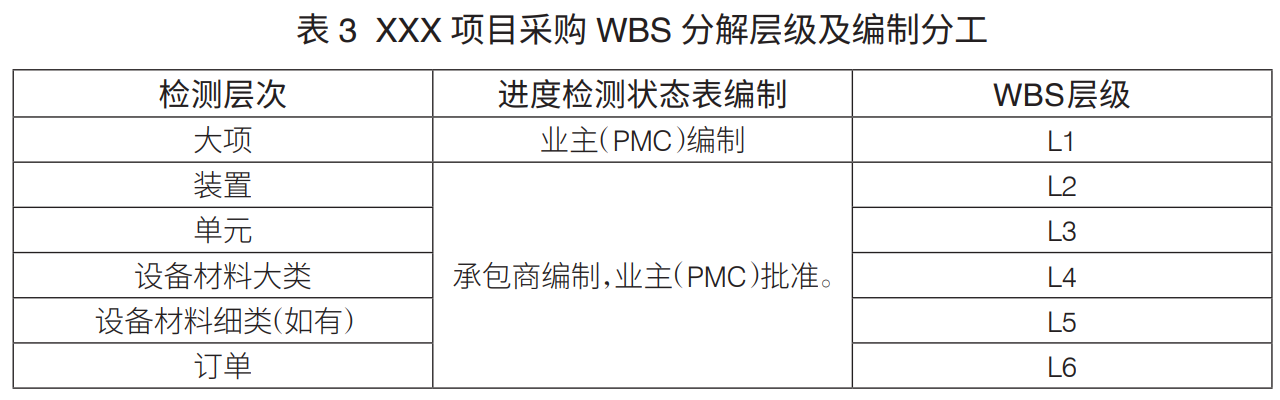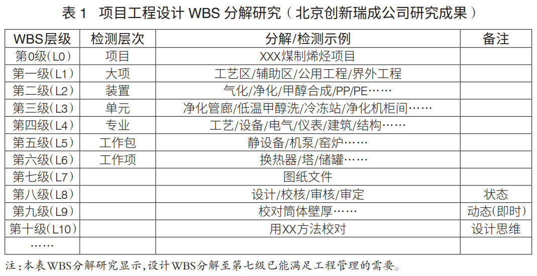 工程項目WBS分解層級:工程項目WBS分解主要是進行設(shè)計、采購、施工WBS分解。通常,設(shè)計WBS分解至七級、采購WBS分解至六級、施工WBS分解至六級,可滿足工程管理要求(表1)。