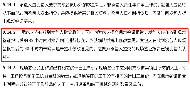 此外,第9.14.2條中,“......發(fā)包人在收到承包人現(xiàn)場簽報(bào)告后的48小時(shí)內(nèi)未確認(rèn)也未提出修改意見的,應(yīng)視為承包人提交的現(xiàn)場簽證報(bào)告已被發(fā)包人認(rèn)可?!?/span>即,從時(shí)限來講,“48小時(shí)”亦非能夠滿足發(fā)包方充分詢價(jià)并與承包方定價(jià)的時(shí)長。