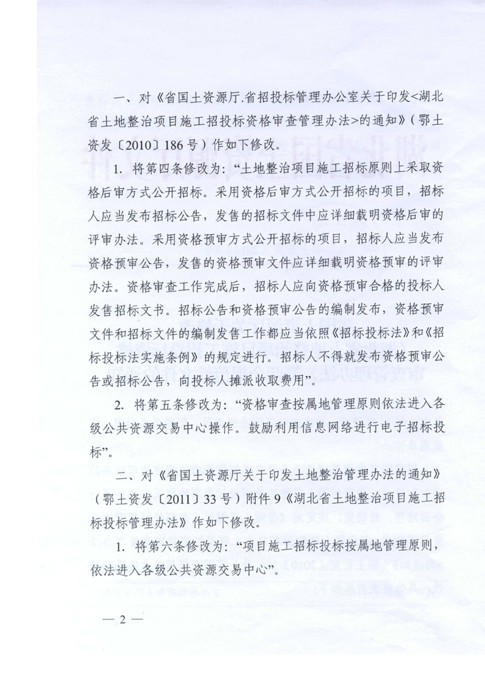 湖北省國(guó)土資源廳關(guān)于修改《湖北省土地整治項(xiàng)目施工招投標(biāo)資格審查辦法》等兩個(gè)規(guī)范性文件的通知