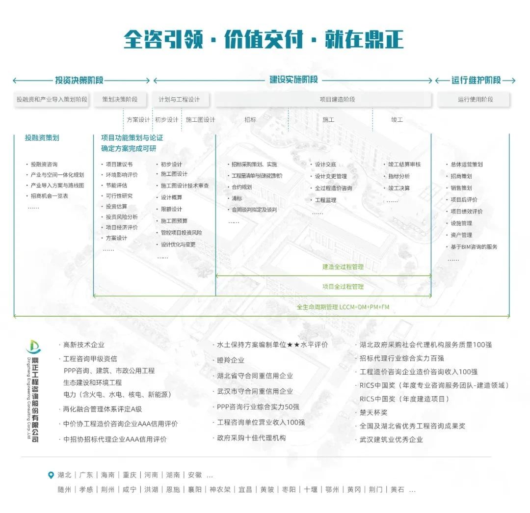 鼎正業(yè)務(wù)涵蓋設(shè)計(jì)咨詢(xún)產(chǎn)業(yè)鏈及工程產(chǎn)品產(chǎn)業(yè)鏈,既包括居住建筑、公共建筑、工業(yè)建筑等建筑設(shè)計(jì)領(lǐng)域,市政排水設(shè)計(jì)、市政道路設(shè)計(jì)等市政設(shè)計(jì)領(lǐng)域及景觀綠化設(shè)計(jì)領(lǐng)域,也包括全過(guò)程工程咨詢(xún)、全過(guò)程產(chǎn)業(yè)咨詢(xún)、投融資咨詢(xún)、項(xiàng)目管理、造價(jià)咨詢(xún)、造價(jià)與法律糾紛咨詢(xún)、招標(biāo)代理等工程投資、造價(jià)、運(yùn)營(yíng)等業(yè)務(wù)。
