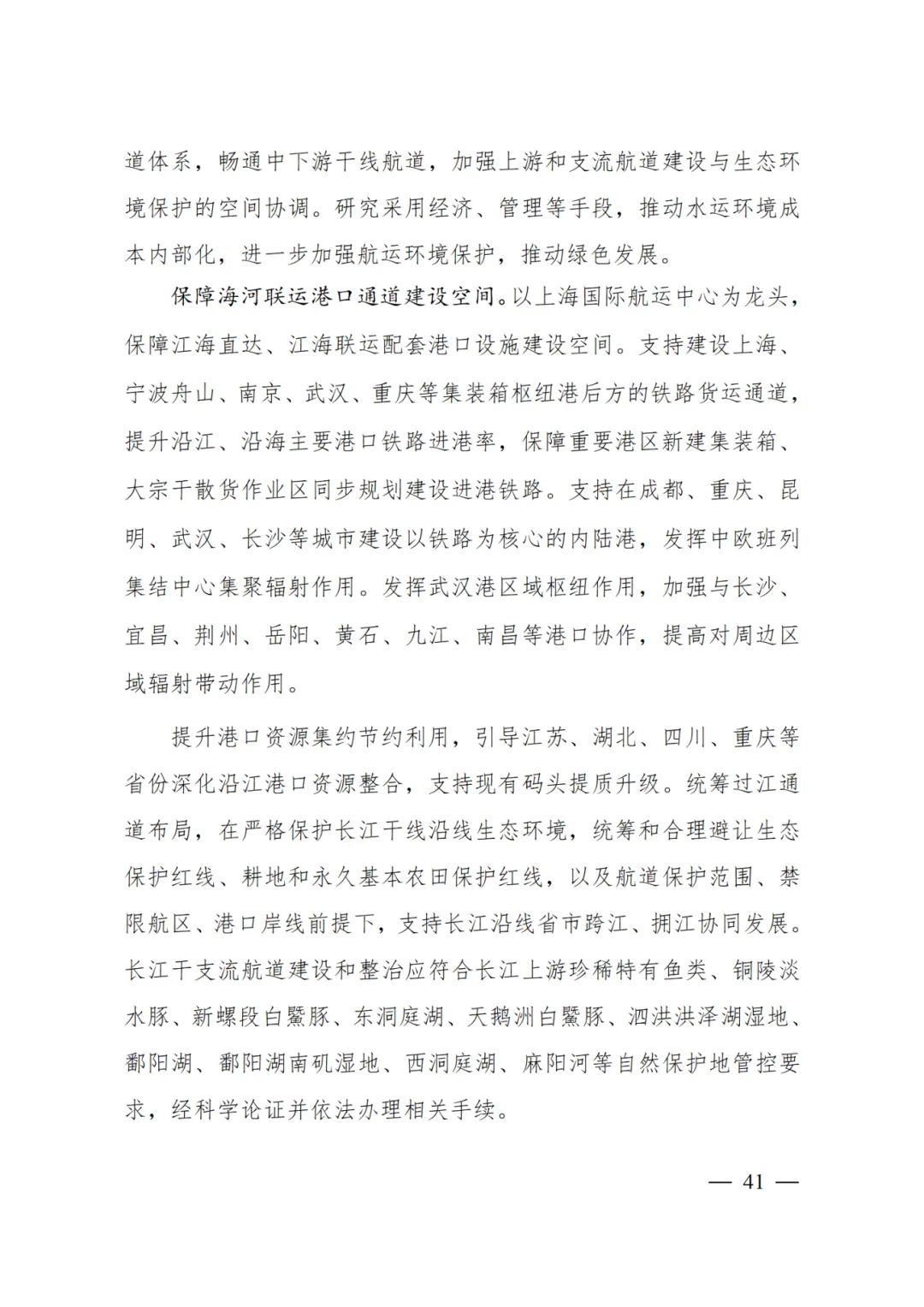 以上海國際航運(yùn)中心為龍頭,保障江海直達(dá)、江海聯(lián)運(yùn)配套港口設(shè)施建設(shè)空間。支持建設(shè)上海、寧波舟山、南京、武漢、重慶等集裝箱樞紐港后方的鐵路貨運(yùn)通道,提升沿江、沿海主要港口鐵路進(jìn)港率,保障重要港區(qū)新建集裝箱、大宗干散貨作業(yè)區(qū)同步規(guī)劃建設(shè)進(jìn)港鐵路。