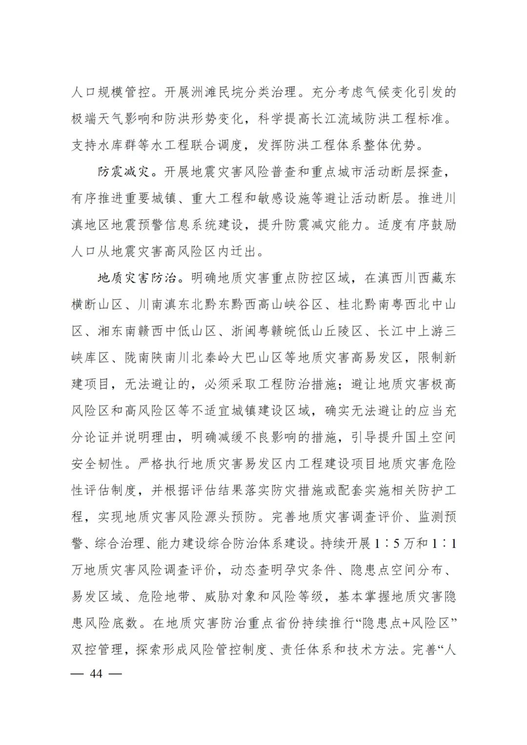 地質(zhì)災(zāi)害防治 明確地質(zhì)災(zāi)害重點(diǎn)防控區(qū)域,在滇西川西藏東橫斷山區(qū)、川南滇東北黔東黔西高山峽谷區(qū)、桂北黔南粵西北中山區(qū)、湘東南贛西中低山區(qū)、浙閩粵贛皖低山丘陵區(qū)、長江中上游三峽庫區(qū)、隴南陜南川北秦嶺大巴山區(qū)等地質(zhì)災(zāi)害高易發(fā)區(qū),限制新建項(xiàng)目,無法避讓的,必須采取工程防治措施;避讓地質(zhì)災(zāi)害極高風(fēng)險(xiǎn)區(qū)和高風(fēng)險(xiǎn)區(qū)等不適宜城鎮(zhèn)建設(shè)區(qū)域,確實(shí)無法避讓的應(yīng)當(dāng)充分論證并說明理由,明確減緩不良影響的措施,引導(dǎo)提升國土空間安全韌性。