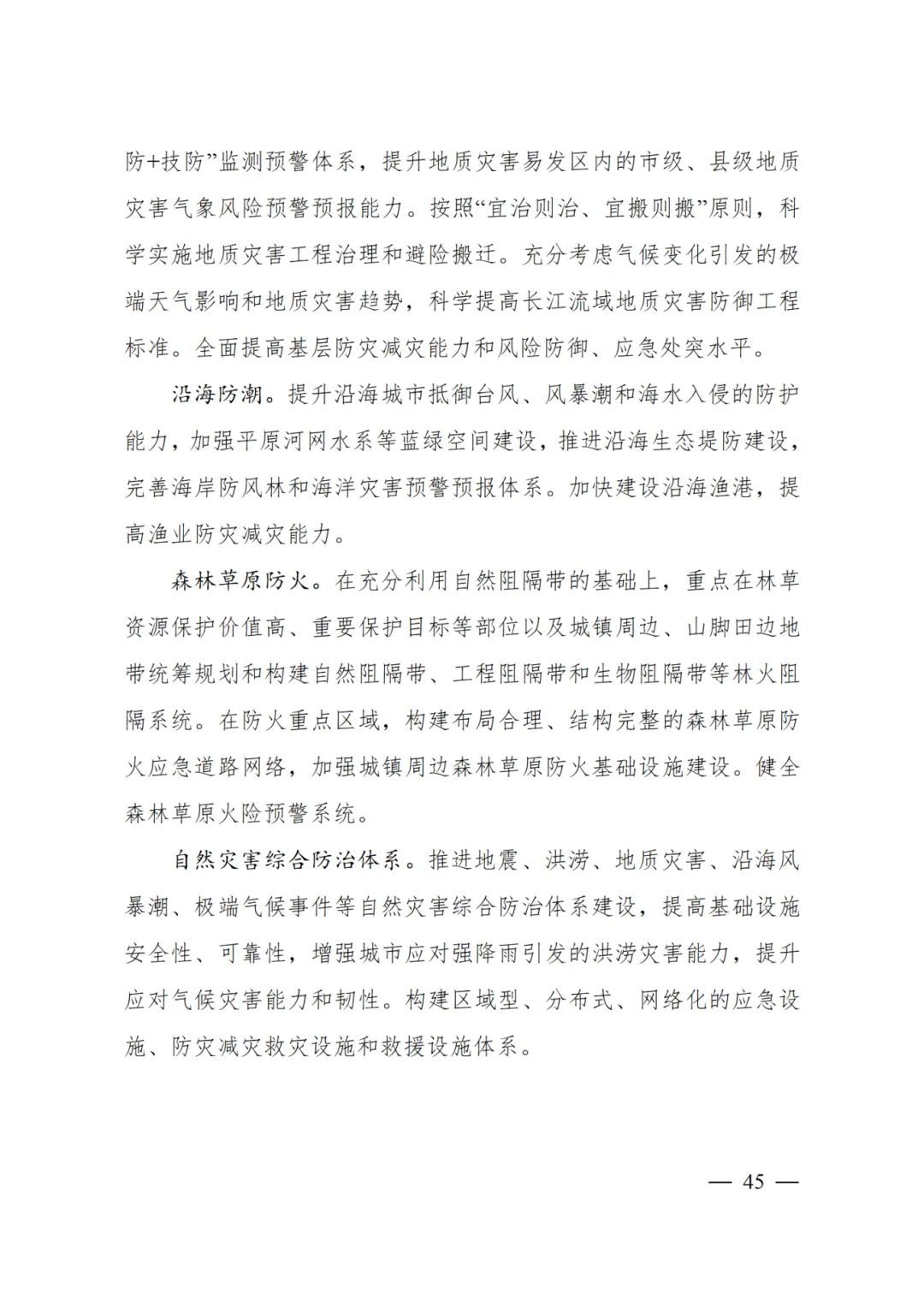 推進(jìn)地震、洪澇、地質(zhì)災(zāi)害、沿海風(fēng)暴潮、極端氣候事件等自然災(zāi)害綜合防治體系建設(shè),提高基礎(chǔ)設(shè)施安全性、可靠性,增強(qiáng)城市應(yīng)對(duì)強(qiáng)降雨引發(fā)的洪澇災(zāi)害能力,提升應(yīng)對(duì)氣候?yàn)?zāi)害能力和韌性。構(gòu)建區(qū)域型、分布式、網(wǎng)絡(luò)化的應(yīng)急設(shè)施、防災(zāi)減災(zāi)救災(zāi)設(shè)施和救援設(shè)施體系。