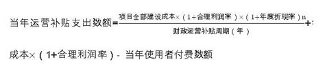對可行性缺口補助模式的項目,在項目運營補貼期間,政府承擔部分直接付費責任。政府每年直接付費數(shù)額包括:社會資本方承擔的年均建設成本(折算成各年度現(xiàn)值)、年度運營成本和合理利潤,再減去每年使用者付費的數(shù)額。計算公式為: