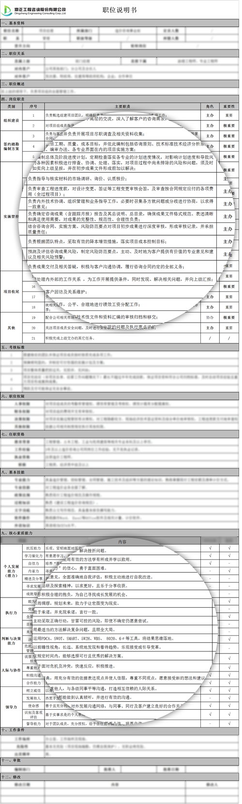 為優(yōu)化人才隊(duì)伍結(jié)構(gòu)及提高能力素質(zhì),鼎正人資部與造價(jià)咨詢事業(yè)部通過對項(xiàng)目經(jīng)理崗位職責(zé)進(jìn)行列舉和歸類,對工作流程、部門內(nèi)各職位間的職責(zé)分配進(jìn)行分析和規(guī)劃,共同編寫了造價(jià)咨詢事業(yè)部項(xiàng)目經(jīng)理崗位說明書,以便項(xiàng)目經(jīng)理和準(zhǔn)項(xiàng)目經(jīng)理們?nèi)轿涣私夤ぷ髂繕?biāo)以及在個(gè)人能力素質(zhì)方面的差距,從而制定合理的學(xué)習(xí)計(jì)劃。